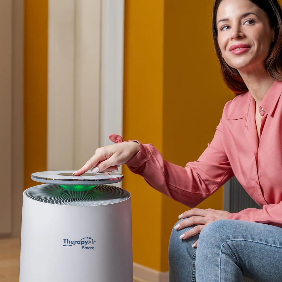 Therapy Air® Smart ist für größere Büros, Open-Space-Bereiche und stark frequentierte Zonen konzipiert. Das System kombiniert HEPA-Filtration, Aktivkohlefilter, negative Ionengenerierung und integriertes UV-C-Licht, um Partikel, Gerüche und Schadstoffe zu reduzieren.