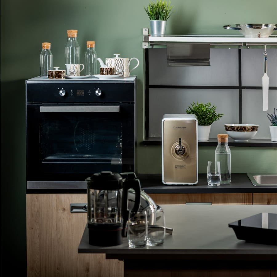 Edel Wasser ist ein kompaktes, elegantes Tischgerät zur Wasseraufbereitung, ideal für kleinere Büros, Studios, Empfangsbereiche und Executive-Küchen.