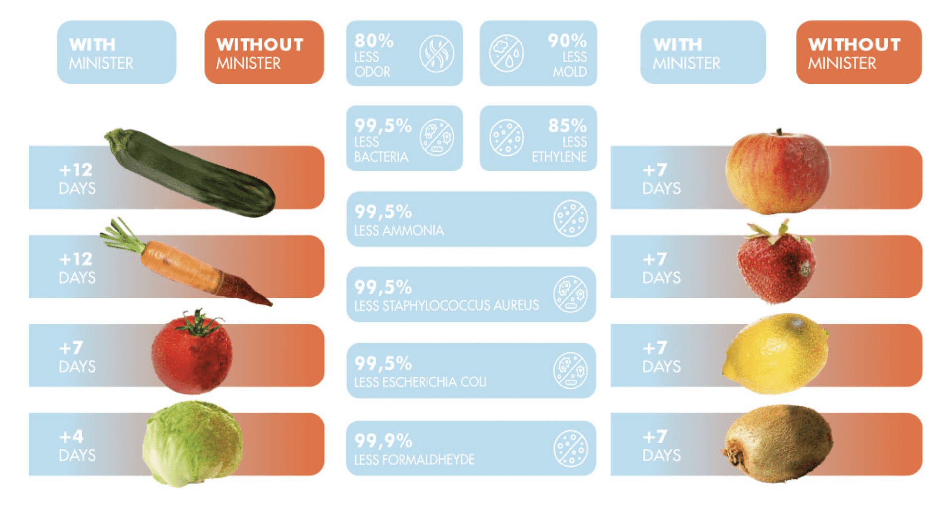 The Therapy Air MiniSter is specifically designed for refrigerators and employes advanced photocatalytic technology. This innovative solution effectively neutralizes ethylene gas, formaldehyde, decreases odor, mold, bacteria, ammonia, staphylococcus aureus, Escherichia coli and other odors naturally released by fruits and vegetables as they mature.