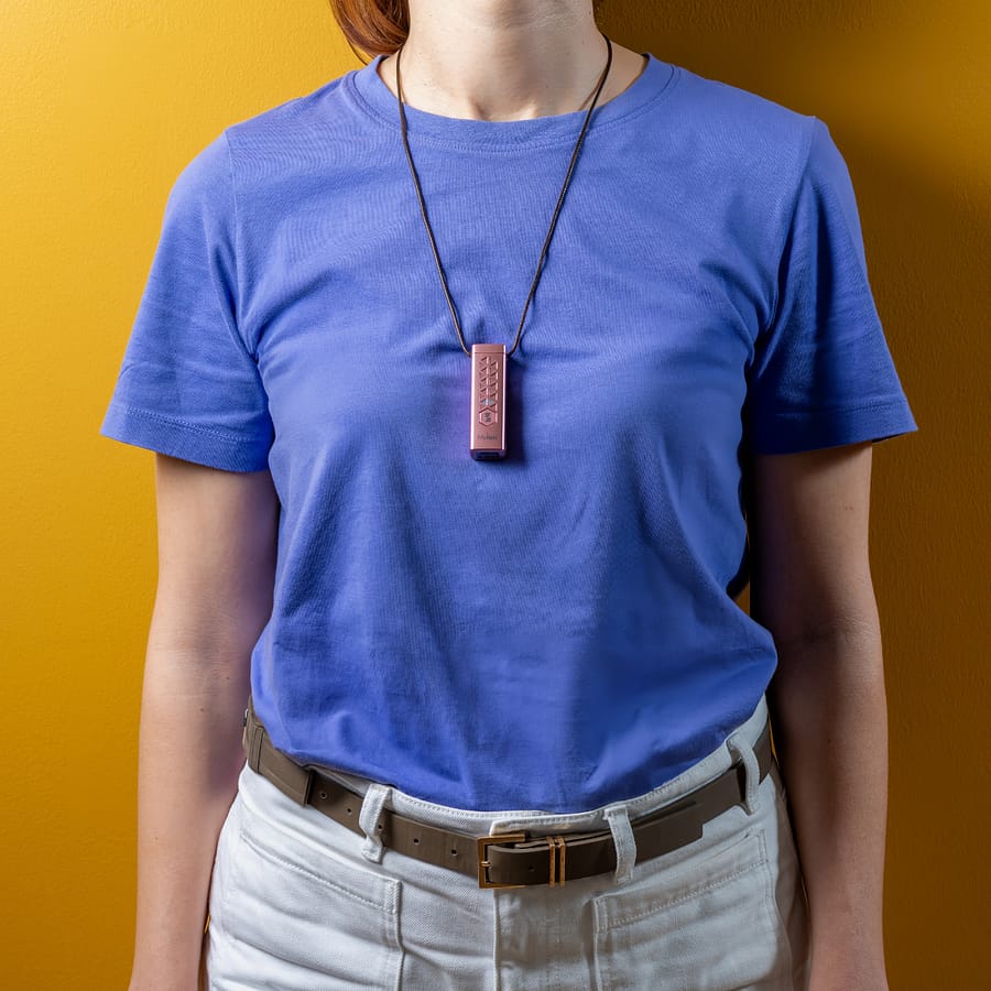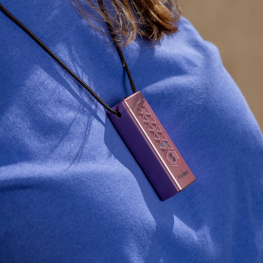 A wearable personal air purifier that creates a cleaner micro-environment around the user.